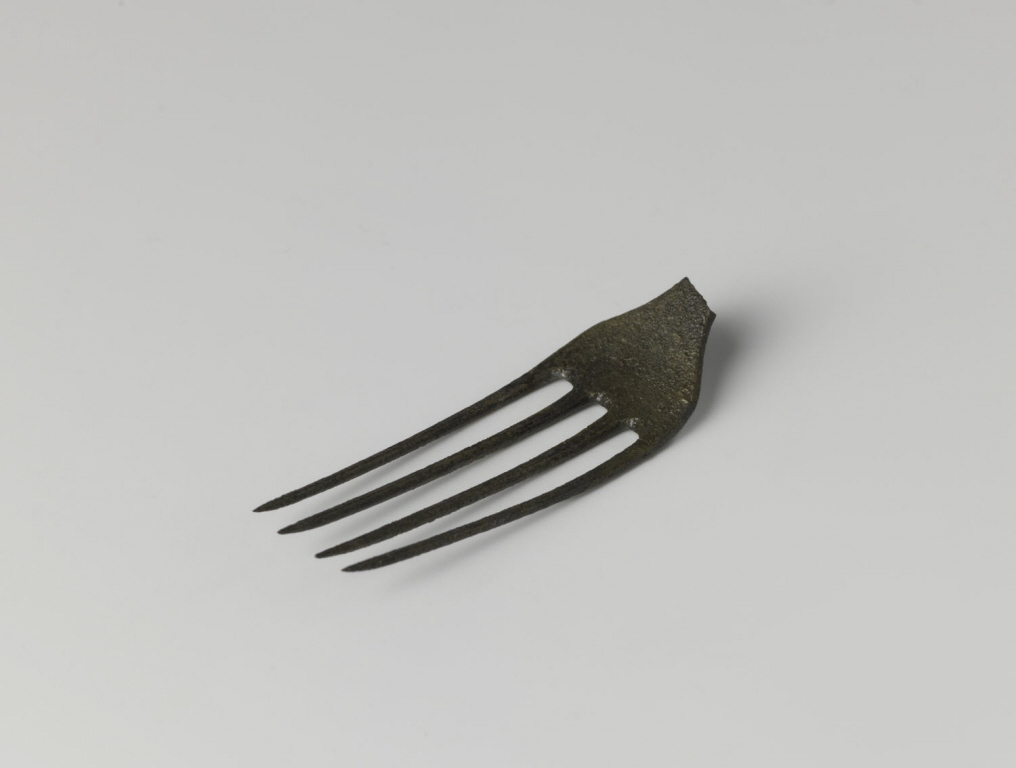Fragment van een zilveren vork met vier ultradunne, lange en scherpe vorktanden, evenredig aan elkaar. Het fragment heeft wel verbindingsstuk, maar geen steel. Vondst uit VOC-scheepswrak 't Vliegend Hert, gezonken in 1735. Collectie RCE. Te zien in de vaste presentatie Ga mee naar zee, ruimte Bepakken en bemannen.