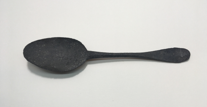 Tinnen eetlepel, met ovale bak of schep, een dunne steel en met profilering dicht bij de bak. Het metaal wordt naar steeleinde platter en eindigt in een plat ovalen geronde punt met een kleine verdikking aan steeluiteinde. De initialen N V D M zijn hier in geslagen. De steel is aan de achterkant door een halfrond ‘lofje’ met bak verbonden en komt overeen met lepels vervaardigd in Engeland. Deze lepel is eigendom geweest van Nicolaas van der Meer, derde meester chirurgijn, afkomstig uit Middelburg. Van der Meer werkte samen met Gilles Ponse, de ondermeester chirurgijn aan boord het schip. Vondst uit VOC-scheepswrak 't Vliegend Hert, gezonken in 1735. Collectie RCE.