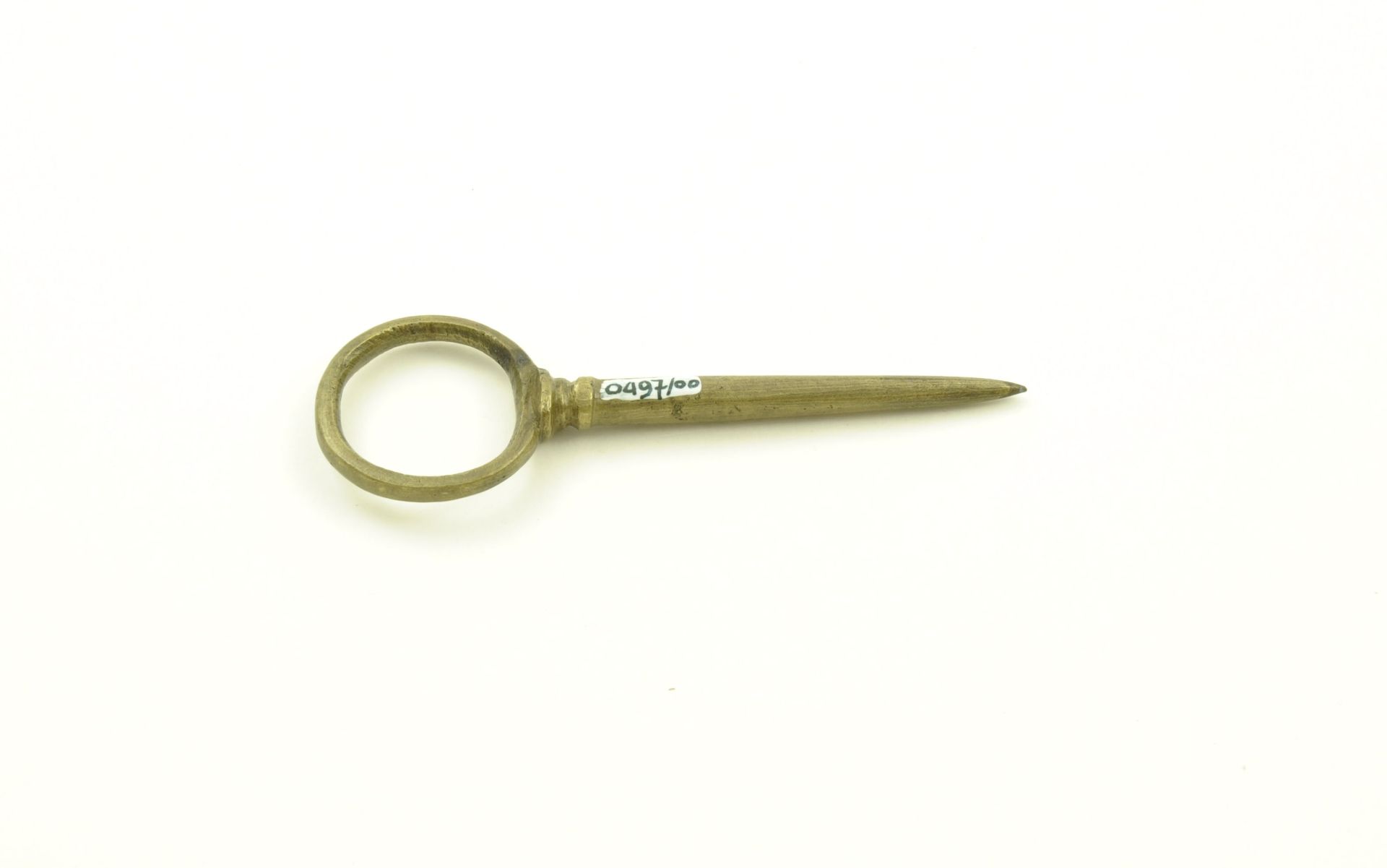 Een instrument om een kurk uit o.a. een wijnfles te halen of te peuteren. Het is gemaakt van een koperleging en een voorloper van onze kurkentrekker met de puntige spiraal. Deze kurkenuithaler lijkt veel op een soort priem met een scherpe punt en een rond uiteinde. Hij werd waarschijnlijk door de bottelier gebruikt, die verantwoordelijk was voor de inkoop en het beheer van levensmiddelen. Dit object was een onderdeel van het tafelgerei en werd gebruikt in de kajuit. Vondst uit VOC-scheepswrak 't Vliegend Hert, gezonken in 1735. Collectie RCE. Dit object is in 2000 opgedoken; met vondstnummer 2000 A0497. In 2001 is een tweede kurkenuithaler opgedoken; met vondstnummer 2001 A0636.