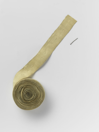 Lint voor gebruik bij kleding, opgerold en van beige zijde en met een kleine speld vastgezet. Vondst uit VOC-scheepswrak 't Vliegend Hert, gezonken in 1735. Collectie RCE. Te zien in de vaste presentatie Ga mee naar zee, ruimte Bepakken en bemannen. Dit object is in 2001 opgedoken; met vondstnummer 2001 A0926.