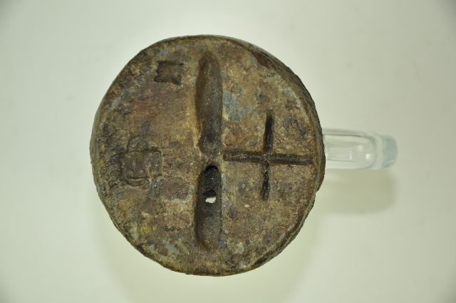 Loden kraag, met daarin een ijkteken met XXX, onderdeel van een krukgewicht