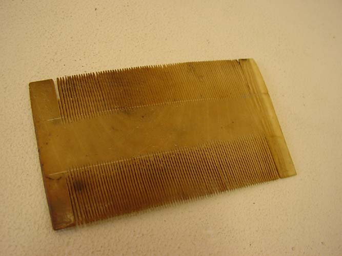 Luizenkam of netenkam, gemaakt van been of hoorn. Aan twee lange zijkanten zijn fijne inkepingen ingesneden om, wanneer door haren gehaald, zoveel mogelijk luizen en neten mee te kunnen verwijderen. Hoofdluis is een van de meest voorkomende probleem aan boord. De fijn getande kam wordt al sinds eeuwen hiervoor gebruikt en aan het ontwerp hiervan is weinig veranderd. Vondst uit VOC-scheepswrak 't Vliegend Hert, gezonken in 1735. Collectie RCE. Dit object is opgedoken in 1991, met vondstnummer 91A0113 (onderdeel 1).